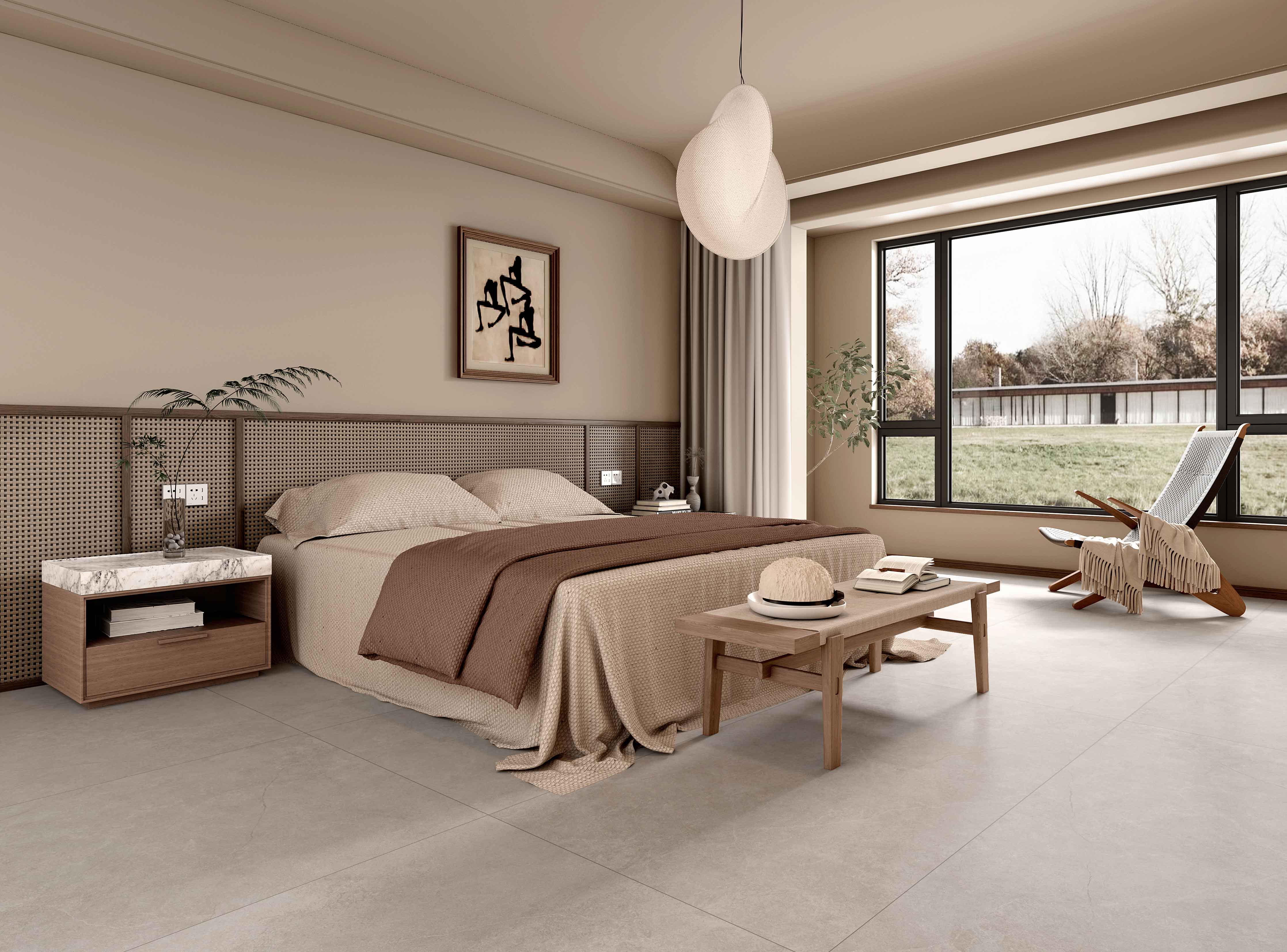 作為奢雅選色淺灰,質(zhì)樸的水泥細(xì)紋版面在淺灰調(diào)基底的映襯下,透露出清冷寧?kù)o的自然氣息,內(nèi)斂且低調(diào)??稍诩揖涌臻g中與其他色彩靈活搭配,賦予設(shè)計(jì)更大的自由度。