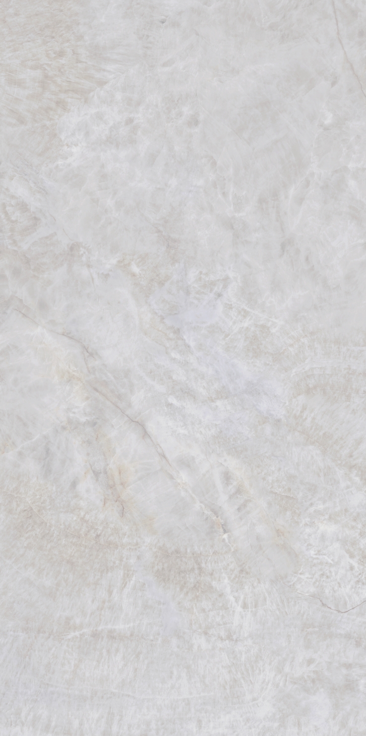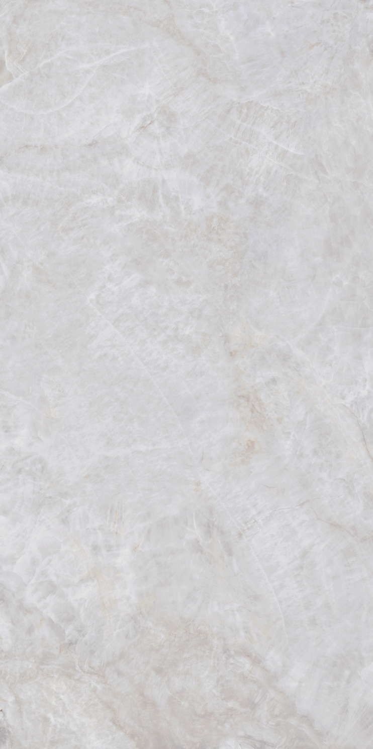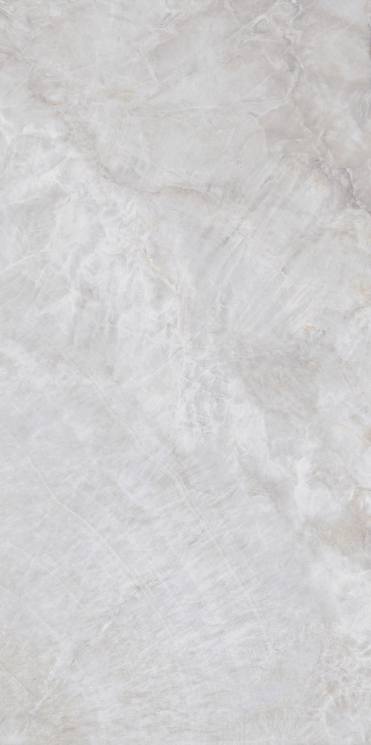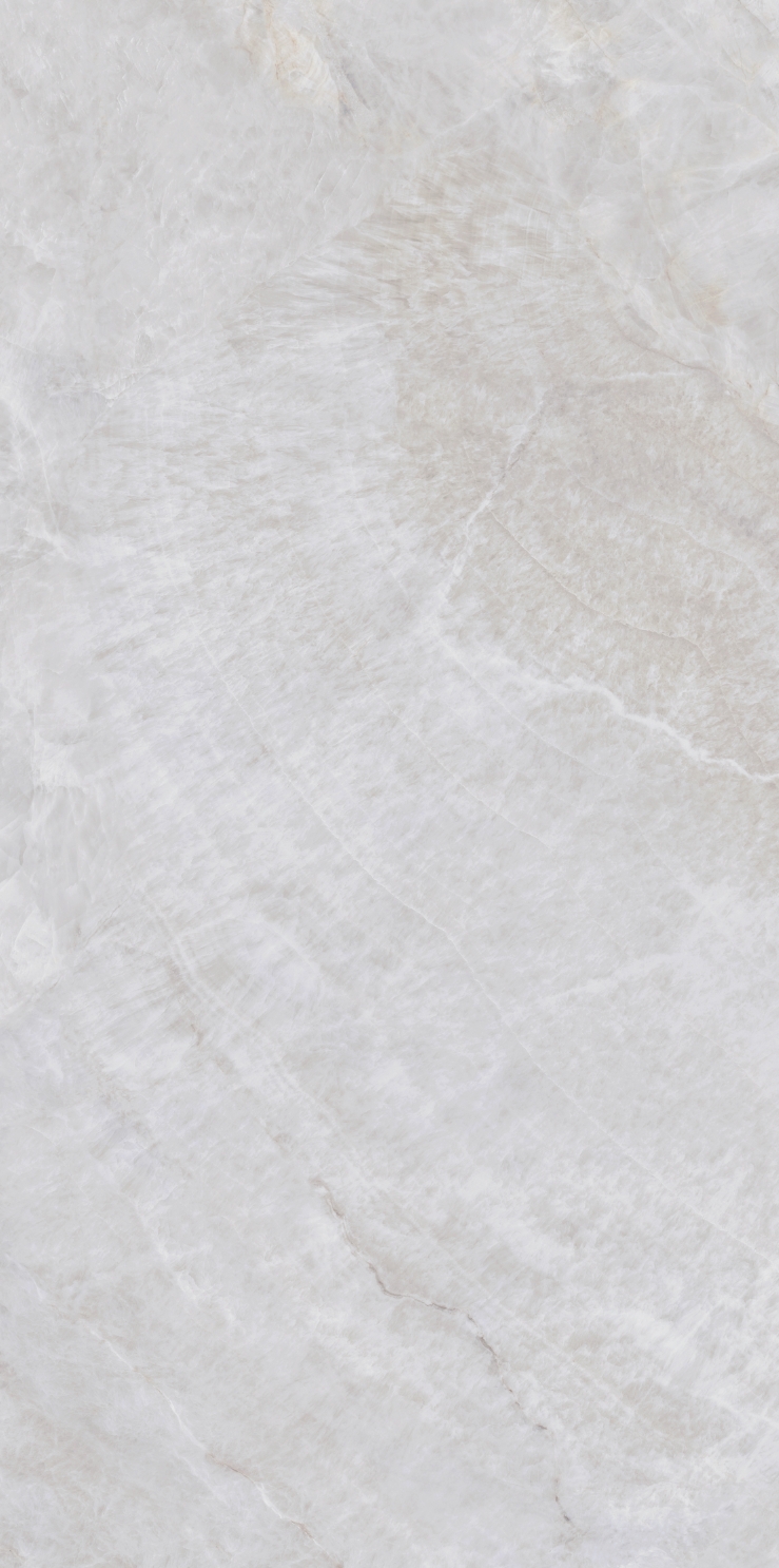 銀灰色的磚面上附著這大片絮狀紋理,形成了絢麗的銀灰色版面,猶如云母貝獨特的生長紋,高透柔美的玉質(zhì)凝脂感和均勻的質(zhì)地,在光線照射下泛起溫婉細膩的虹彩。