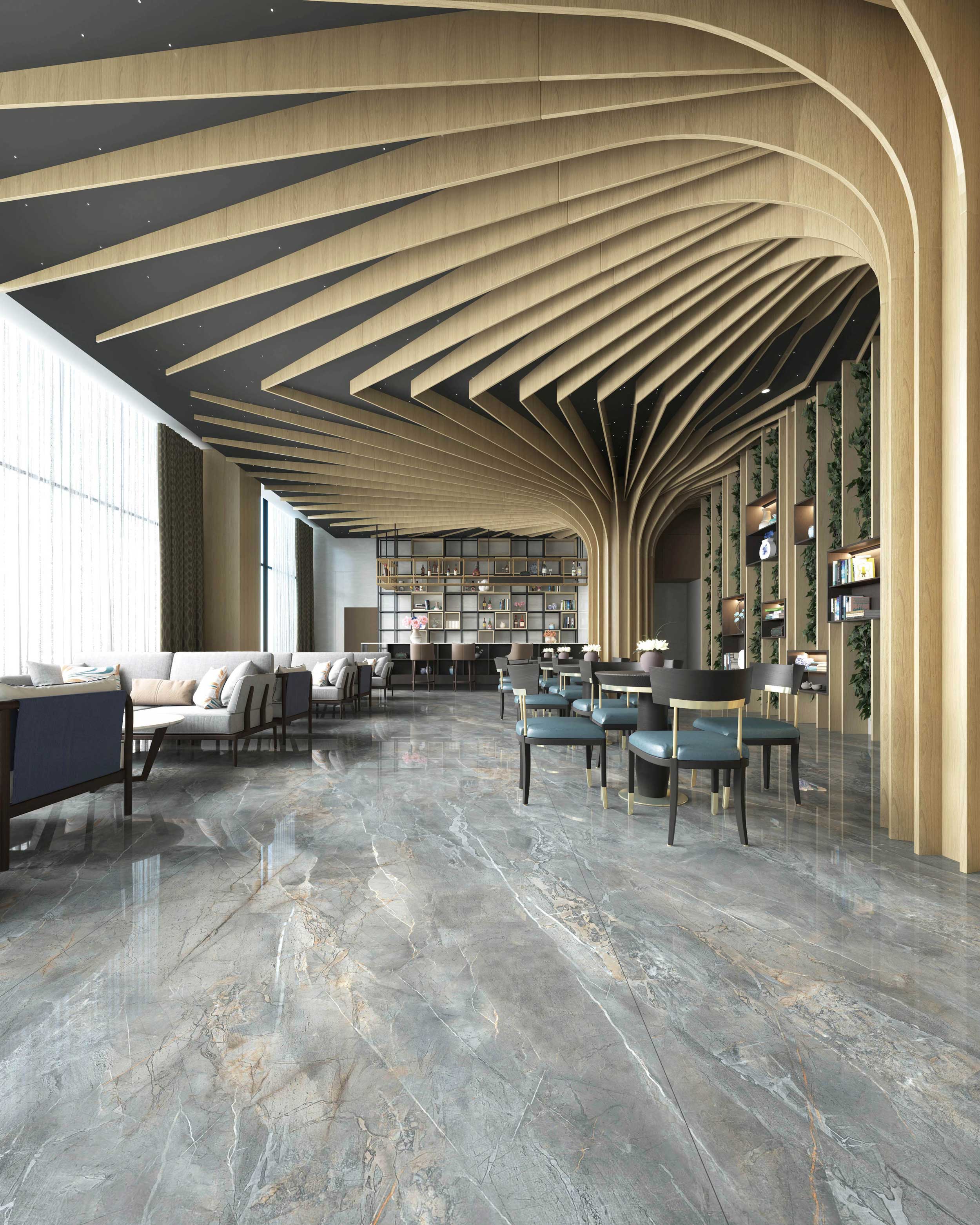 水寬山遠(yuǎn)煙嵐迥,柳岸縈回在碧流。設(shè)計靈感來自日夜交替的纏綿與流連,藍(lán)、棕、灰的色彩傳遞出寧靜雅致的氛圍,豐富幻變的肌理則賦予空間多樣化的搭配靈感。